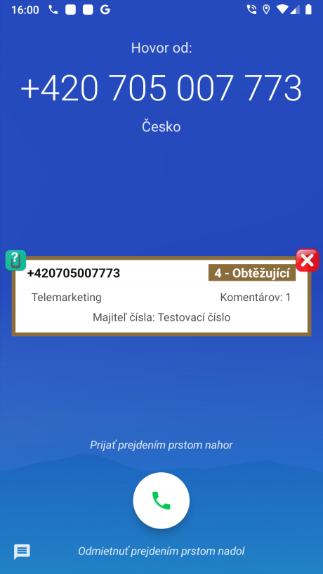 Jednou z hlavných funkcií aplikácie je aktívna notifikácia. Vďaka tejto skvelej funkcii viete u neznámeho čísla skôr, než prichádzajúci hovor zdvihnete, či si máte na číslo dávať pozor alebo nie. Aktívna notifikácia je malý rámček nesúci informáciu o danom telefónnom čísle. Zobrazí sa iba v prípade, že toto číslo nemáte vo svojom zozname kontaktov a o danom čísle je záznam v našej databáze. Táto funkcia je po nainštalovaní automaticky zapnutá, vypnúť ju môžete v nastaveniach aplikácie. Či je funkcia zapnutá spoznáte pomocou trvalé notifikácia "Ochrana je aktívna". V nastavení aktívnej notifikácie je možné nastaviť aj jej umiestnenie. Rôzne telefóny môžu mať rôzne obrazovky pri prichádzajúcom hovore a môže sa teda stať, že rámček s informáciou prekryje niektorú dôležitú časť pôvodnej obrazovky. Preto je potrebné si túto pozíciu vyskúšať a starostlivo nastaviť v nastavení. Pre Android 9 a 10 (alebo vyššie) je potreba tiež správne nastaviť systémové povolenie pre zobrazenie cez iné aplikácie.